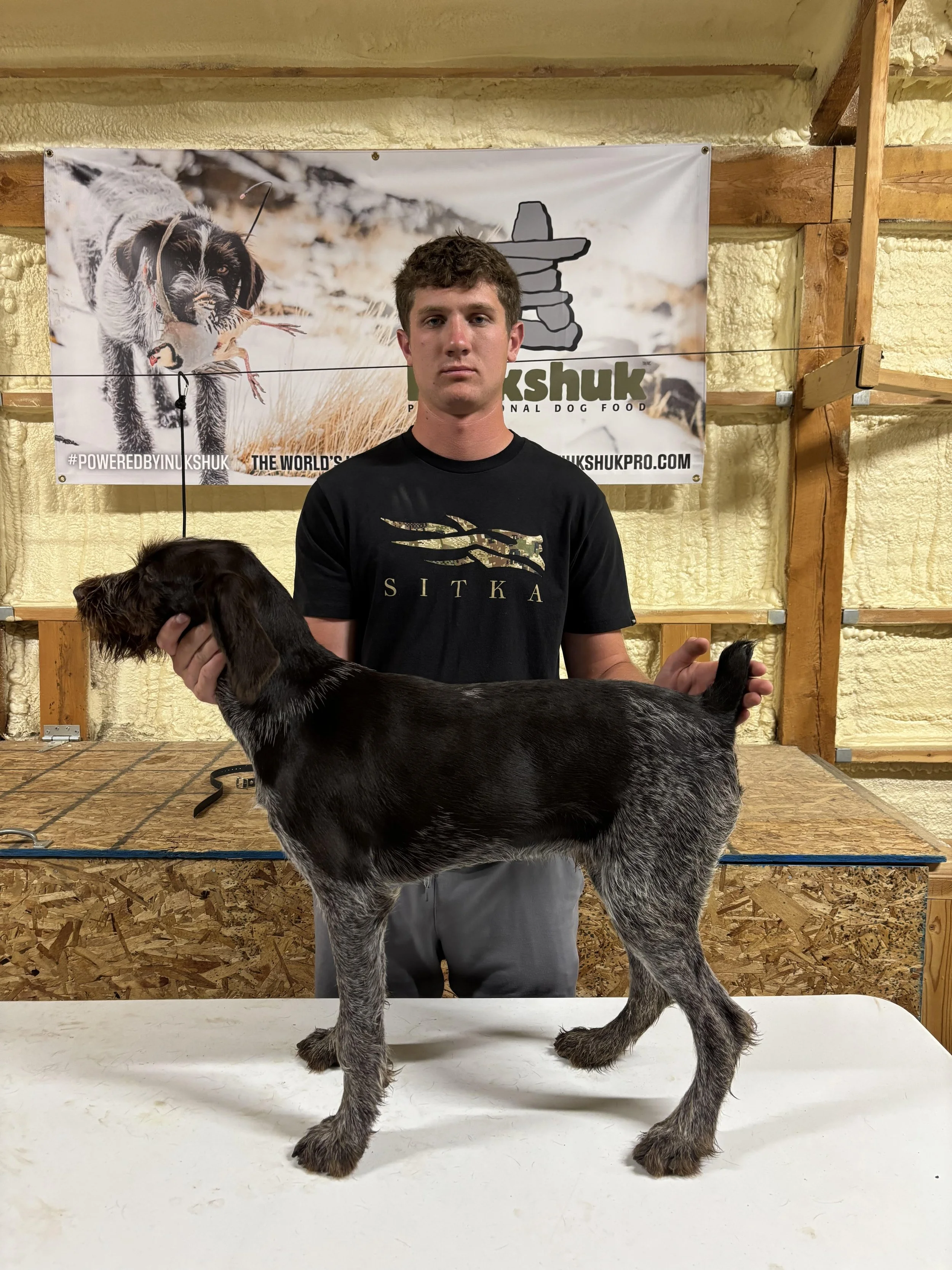 Intact registered 11 month old German Wirehaired pointer. He’s a big ranging dog with a very independent search for being so young, but naturally pace’s himself and can go all day early season in the heat with not needing to pack a lot of water. He is super light on his feet and still going and hardly breathing when other dogs are gassed or looking for shade and water. We’ve experienced this running him horseback on the prairies this summer. Has dark tough feet. Has a very tight short slick coat without facial furnishings. Has been on wild birds late last season but still needs more experience on handling wild birds. Is broke to gun, and transitioned as quickly as any of our young dogs through positive reinforcement with clicker/platform training to negative reinforcement with e-collar conditioning on recall and whoa. He also recalls very naturally without e-collar. If he gets lost and can hear whistle he is looking to return quickly as we follow his search with gps and though a big ranging dog, still checks in regularly. He is steady to wing and naturally honors/backs other dogs on point better than some dogs that have been through backing program with silhouette. He has a great nose and natural retrieve(brings right to hand). If you want to purchase him you will need to be a serious upland wild bird hunter that goes regularly and is experienced at handling big running dogs. We would keep this dog for breeding purposes if he had a beard as he has all other qualities we look for in our breeding program. This is the dog I’d want if I hunted public land wild birds 2-3 times a week or more and was hiking long distances. He will cover 3 to 4 times the miles you hike on the gps during a chukar hunt. Price is firm as we aren’t anxious to sale and will hunt this dog this fall rather than sale him to the wrong person where he cannot reach his potential.